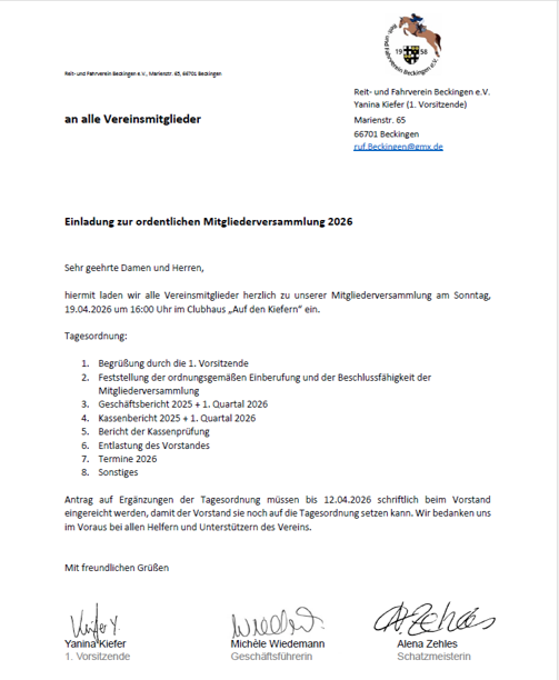 am Sonntag, den 19.04.2026, findet um 16:00 Uhr im Clubhaus „Auf den Kiefern“ unsere ordentliche Mitgliederversammlung statt. Die offizielle Einladung haben wir hier beigefügt.